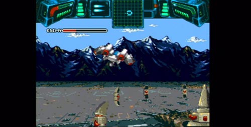 Variety is also bolstered by the transformations that your ship will make between levels. In addition to the standard space-faring Strike Craft, several levels abandon the “into-the-screen” format in favour of levels that feature 360 degree movement where you’ll get to pilot a hovering Turbo Copter or a mechanized walking tank called the Strike Walker.